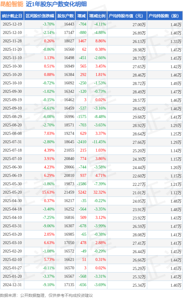 从股价来看,2025年12月10日至2025年12月19日,昆船智能区间跌幅为3.7%,在此期间股东户数减少704.0户,减幅为4.11%。