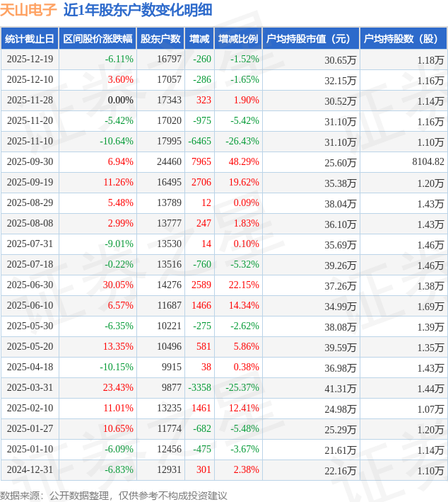 证券之星消息,近日天山电子披露,截至2025年12月19日公司股东户数为1.68万户,较12月10日减少260.0户,减幅为1.52%。户均持股数量由上期的1.16万股增加至1.18万股,户均持股市值为30.65万元。