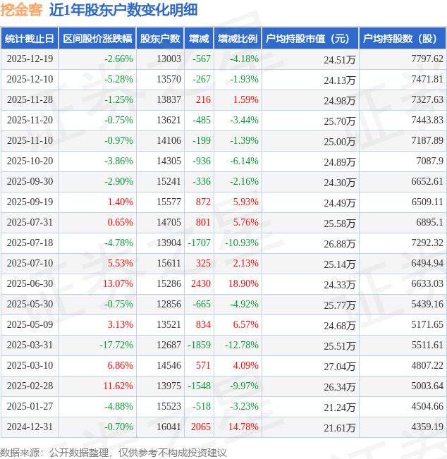 从股价来看,2025年12月10日至2025年12月19日,挖金客区间跌幅为2.66%,在此期间股东户数减少567.0户,减幅为4.18%。