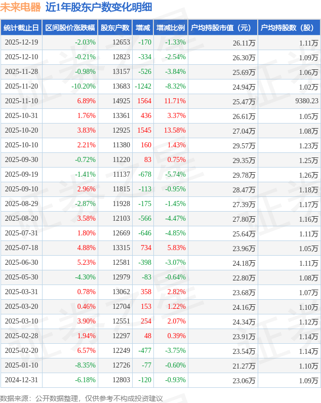 证券之星消息,近日未来电器披露,截至2025年12月19日公司股东户数为1.27万户,较12月10日减少170.0户,减幅为1.33%。户均持股数量由上期的1.09万股增加至1.11万股,户均持股市值为26.11万元。