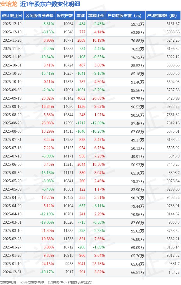 从股价来看,2025年12月10日至2025年12月19日,安培龙区间跌幅为8.81%,在此期间股东户数减少484.0户,减幅为2.48%。