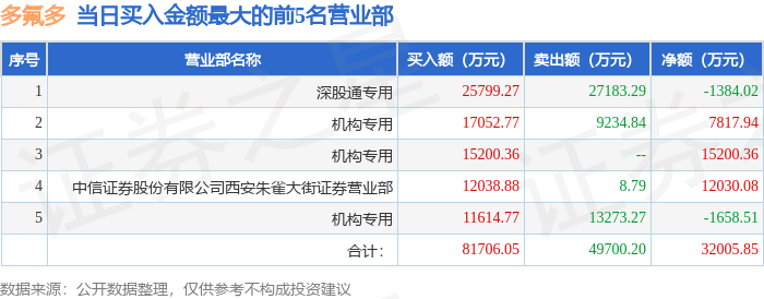 证券之星消息,沪深交易所2025年12月23日公布的交易公开信息显示,多氟多(002407)因日涨幅偏离值达到7%的前5只证券登上龙虎榜。此次是近5个交易日内第1次上榜。