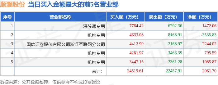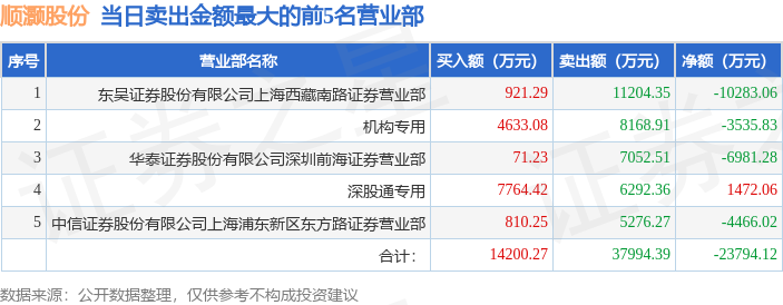 证券之星消息,沪深交易所2025年12月23日公布的交易公开信息显示,顺灏股份(002565)因日跌幅偏离值达到7%的前5只证券登上龙虎榜。此次是近5个交易日内第3次上榜。
