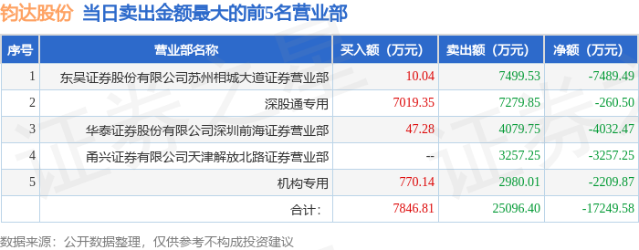 证券之星消息,沪深交易所2025年12月23日公布的交易公开信息显示,钧达股份(002865)因日跌幅偏离值达到7%的前5只证券登上龙虎榜。此次是近5个交易日内第2次上榜。