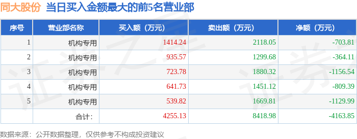 从龙虎榜公布的当日买卖数据来看,机构合计净卖出4163.85万元。