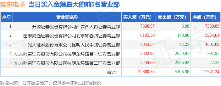 证券之星消息,沪深交易所2025年12月23日公布的交易公开信息显示,奕东电子(301123)因日涨幅达到15%的前5只证券登上龙虎榜。此次是近5个交易日内第3次上榜。