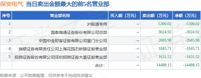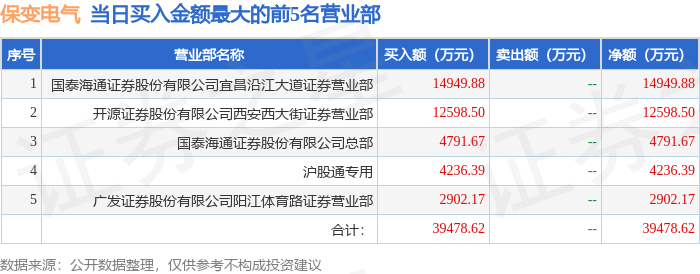 证券之星消息,沪深交易所2025年12月23日公布的交易公开信息显示,保变电气(600550)因有价格涨跌幅限制的日收盘价格涨幅偏离值达到7%的前五只证券登上龙虎榜。此次是近5个交易日内第1次上榜。