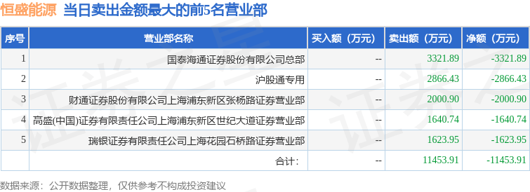 证券之星消息,沪深交易所2025年12月23日公布的交易公开信息显示,恒盛能源(605580)因有价格涨跌幅限制的日收盘价格跌幅偏离值达到7%的前五只证券登上龙虎榜。此次是近5个交易日内第1次上榜。