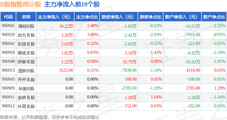 资金流向方面,B股指数(000003)成份股当日主力资金净流出合计4.16万元,游资资金净流出合计15.26万元,散户资金净流入合计19.43万元。成份股资金流向详情见下表: