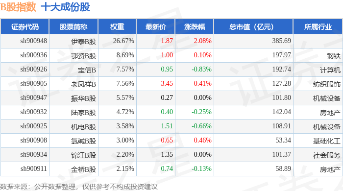 证券之星消息,12月23日,B股指数(000003)报收于249.17点,涨0.38%,成交1.11亿元,换手率0.15%。当日该指数成份股中,上涨的有10家,耀皮B股以2.56%的涨幅领涨,下跌的有27家,锦在线B以2.53%的跌幅领跌。