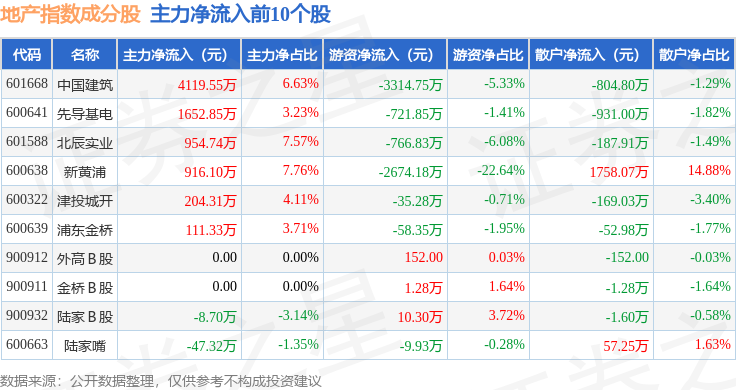 资金流向方面,地产指数(000006)成份股当日主力资金净流出合计2.0亿元,游资资金净流入合计1136.4万元,散户资金净流入合计1.89亿元。成份股资金流向详情见下表: