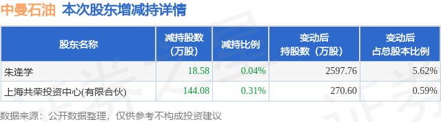 证券之星消息,12月23日中曼石油发布公告《中曼石油:中曼石油天然气集团股份有限公司关于持股5%以上的股东权益变动触及1%刻度的提示性公告》,其股东朱逢学、上海共荣投资中心(有限合伙)于2025年12月19日至2025年12月22日间合计减持162.66万股,占公司目前总股本的0.3518%,变动期间该股股价上涨1.36%,截止12月22日收盘报22.38元。