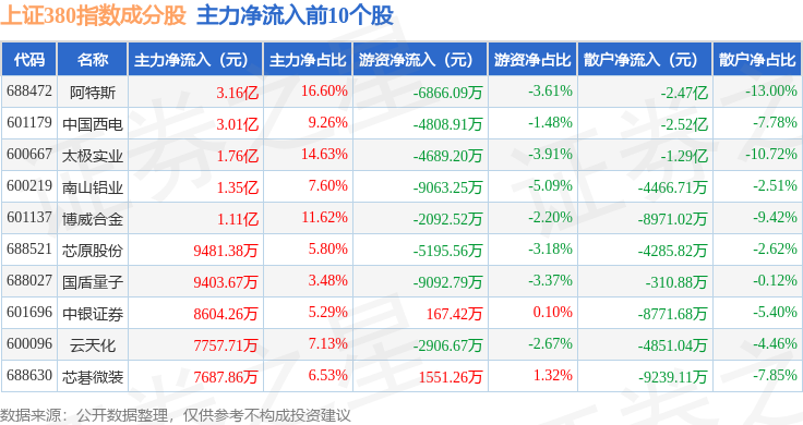 资金流向方面,上证380(000009)指数成份股当日主力资金净流出合计95.13亿元,游资资金净流入合计22.62亿元,散户资金净流入合计72.51亿元。成份股资金流向详情见下表: