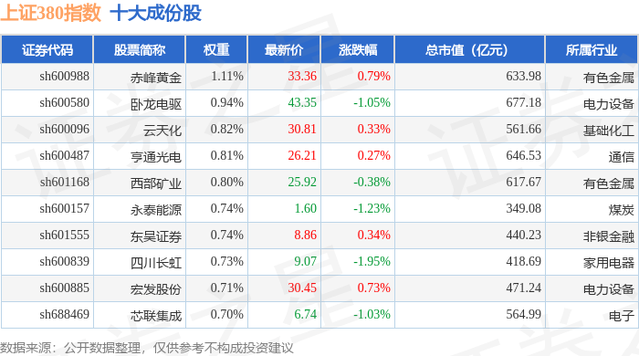 上证380(000009)指数十大成份股详情如下: