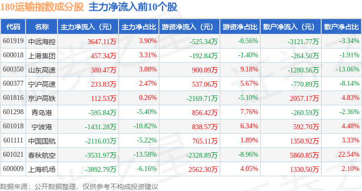 资金流向方面,180运输(000027)指数成份股当日主力资金净流出合计2.31亿元,游资资金净流入合计5783.76万元,散户资金净流入合计1.73亿元。成份股资金流向详情见下表: