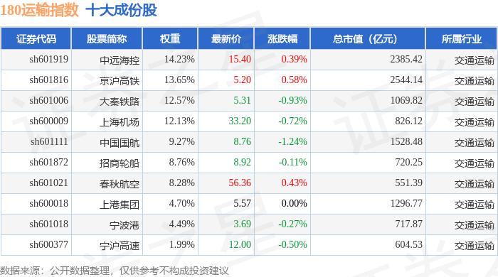180运输(000027)指数十大成份股详情如下: