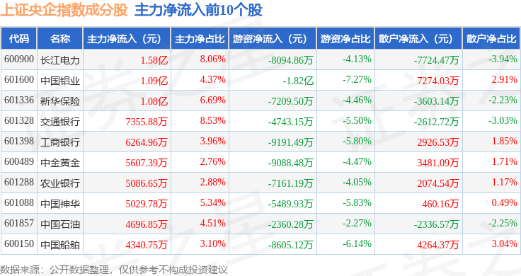 资金流向方面,上证央企(000042)指数成份股当日主力资金净流出合计32.48亿元,游资资金净流入合计3.61亿元,散户资金净流入合计28.87亿元。成份股资金流向详情见下表: