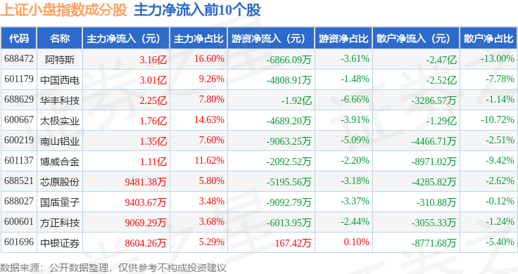 资金流向方面,上证小盘(000045)指数成份股当日主力资金净流出合计115.19亿元,游资资金净流入合计21.72亿元,散户资金净流入合计93.47亿元。成份股资金流向详情见下表: