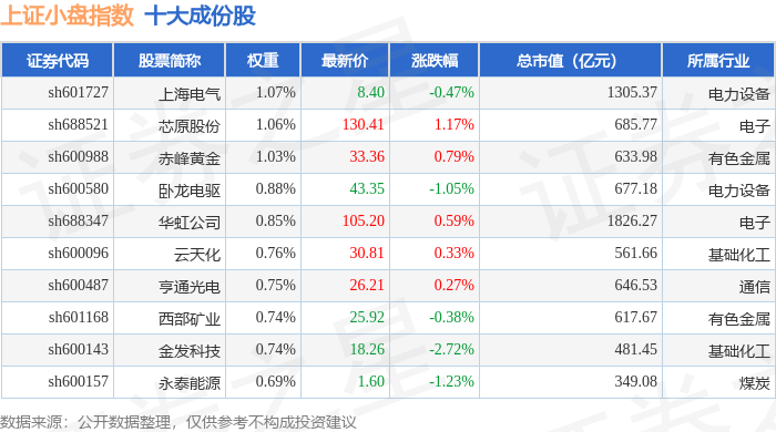 上证小盘(000045)指数十大成份股详情如下: