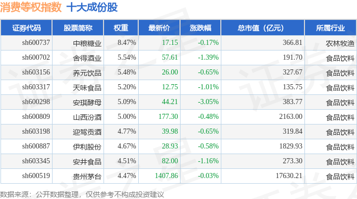 消费等权(000074)指数十大成份股详情如下: