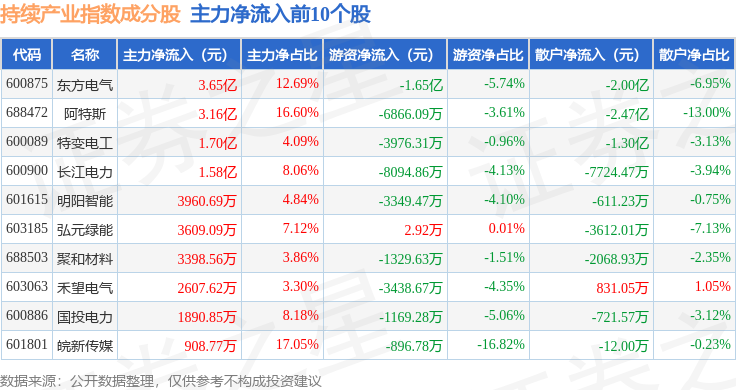 资金流向方面,持续产业(000114)指数成份股当日主力资金净流入合计6.34亿元,游资资金净流出合计3.38亿元,散户资金净流出合计2.96亿元。成份股资金流向详情见下表: