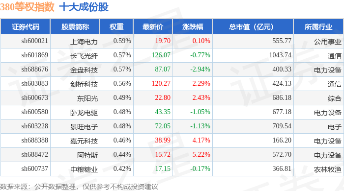 380等权(000115)指数十大成份股详情如下: