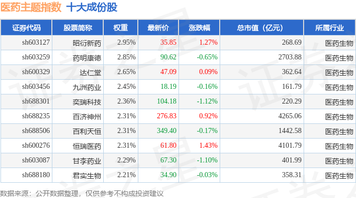 证券之星消息,12月23日,医药主题(000121)指数报收于8103.52点,跌0.5%,成交141.71亿元,换手率0.75%。当日该指数成份股中,上涨的有15家,艾力斯以1.8%的涨幅领涨,下跌的有35家,联影医疗以2.37%的跌幅领跌。