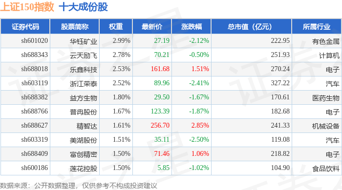 证券之星消息,12月23日,上证150(000133)指数报收于6562.57点,跌0.37%,成交432.55亿元,换手率3.8%。当日该指数成份股中,上涨的有39家,华丰科技以14.27%的涨幅领涨,下跌的有111家,曲江文旅以10.03%的跌幅领跌。
