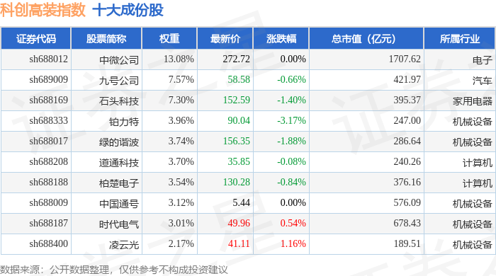 科创高装(000687)指数十大成份股详情如下: