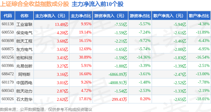 资金流向方面,上证综合全收益(000888)指数成份股当日主力资金净流出合计290.58亿元,游资资金净流入合计49.83亿元,散户资金净流入合计240.75亿元。成份股资金流向详情见下表: