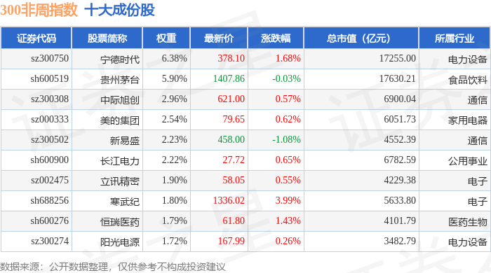 证券之星消息,12月23日,300非周(000969)指数报收于5340.56点,涨0.15%,成交3136.7亿元,换手率0.79%。当日该指数成份股中,上涨的有58家,天赐材料以9.37%的涨幅领涨,下跌的有133家,中国卫通以9.3%的跌幅领跌。