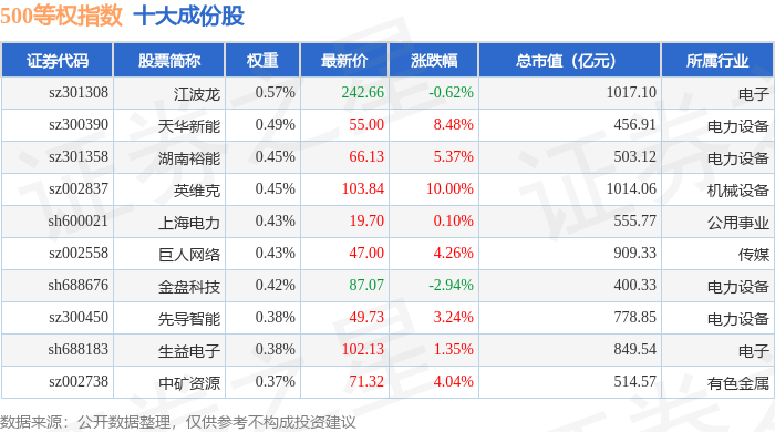 500等权(000982)指数十大成份股详情如下: