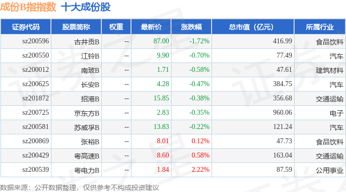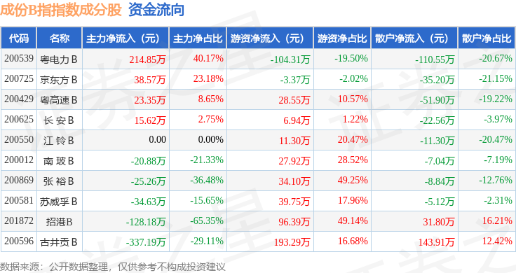 资金流向方面,成份B指(399003)指数成份股当日主力资金净流出合计253.76万元,游资资金净流入合计330.57万元,散户资金净流出合计76.8万元。成份股资金流向详情见下表: