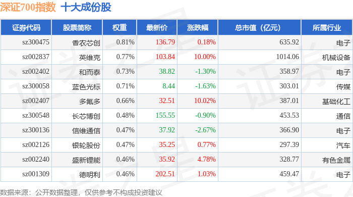 证券之星消息,12月23日,深证700(399010)指数报收于8582.78点,跌0.06%,成交3418.57亿元,换手率2.77%。当日该指数成份股中,上涨的有200家,宏达电子以20.0%的涨幅领涨,下跌的有490家,上海瀚讯以10.4%的跌幅领跌。