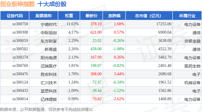 创业板综(399102)指数十大成份股详情如下: