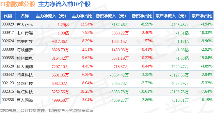 资金流向方面,IT指数(399239)成份股当日主力资金净流出合计32.14亿元,游资资金净流入合计8.14亿元,散户资金净流入合计24.01亿元。成份股资金流向详情见下表: