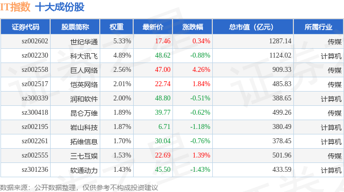 证券之星消息,12月23日,IT指数(399239)报收于1978.7点,跌0.92%,成交712.62亿元,换手率2.77%。当日该指数成份股中,上涨的有36家,完美世界以5.68%的涨幅领涨,下跌的有208家,创识科技以19.99%的跌幅领跌。