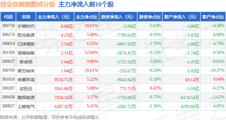 资金流向方面,创业低碳(399259)指数成份股当日主力资金净流入合计14.13亿元,游资资金净流出合计8.61亿元,散户资金净流出合计5.52亿元。成份股资金流向详情见下表: