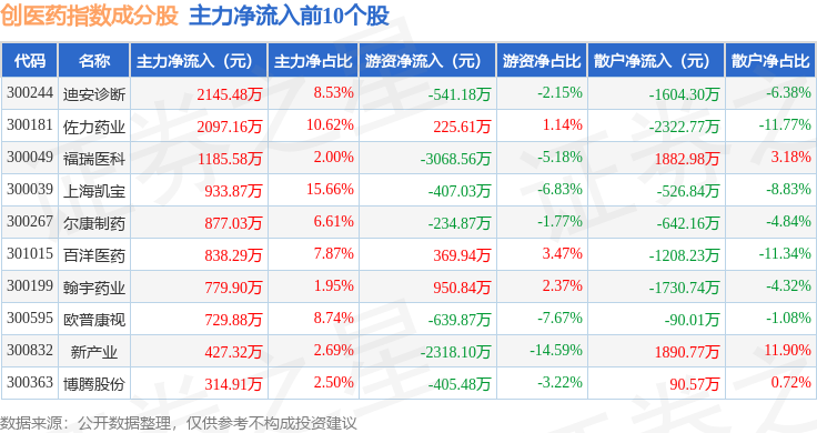 资金流向方面,创医药(399275)指数成份股当日主力资金净流出合计6.72亿元,游资资金净流入合计4575.67万元,散户资金净流入合计6.27亿元。成份股资金流向详情见下表: