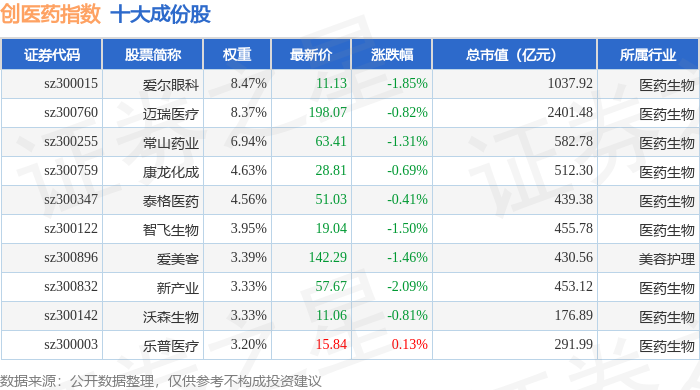 证券之星消息,12月23日,创医药(399275)指数报收于2634.18点,跌0.8%,成交107.09亿元,换手率1.12%。当日该指数成份股中,上涨的有11家,福瑞医科以2.4%的涨幅领涨,下跌的有39家,一品红以3.14%的跌幅领跌。