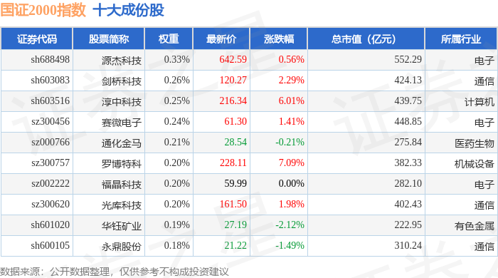 证券之星消息,12月23日,国证2000(399303)指数报收于9692.47点,跌0.32%,成交6261.02亿元,换手率3.0%。当日该指数成份股中,上涨的有572家,奕东电子以20.0%的涨幅领涨,下跌的有1398家,创识科技以19.99%的跌幅领跌。