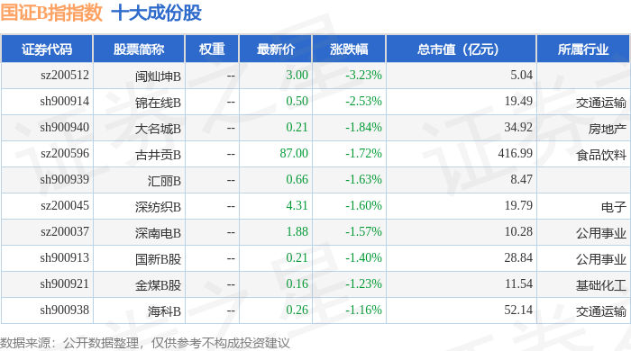 证券之星消息,12月23日,国证B指(399318)指数报收于5056.82点,跌0.06%,成交1.53亿元,换手率0.13%。当日该指数成份股中,上涨的有15家,耀皮B股以2.56%的涨幅领涨,下跌的有49家,闽灿坤B以3.23%的跌幅领跌。