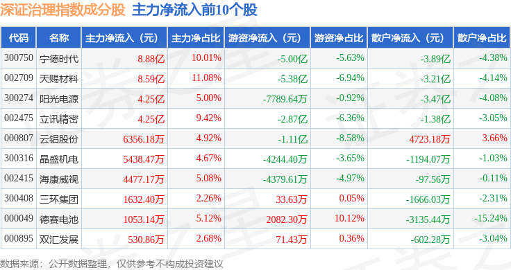 资金流向方面,深证治理(399328)指数成份股当日主力资金净流入合计5.64亿元,游资资金净流出合计9.26亿元,散户资金净流入合计3.62亿元。成份股资金流向详情见下表: