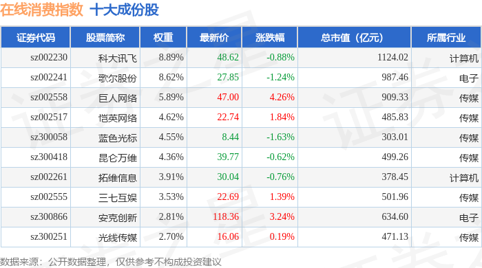 在线消费(399361)指数十大成份股详情如下: