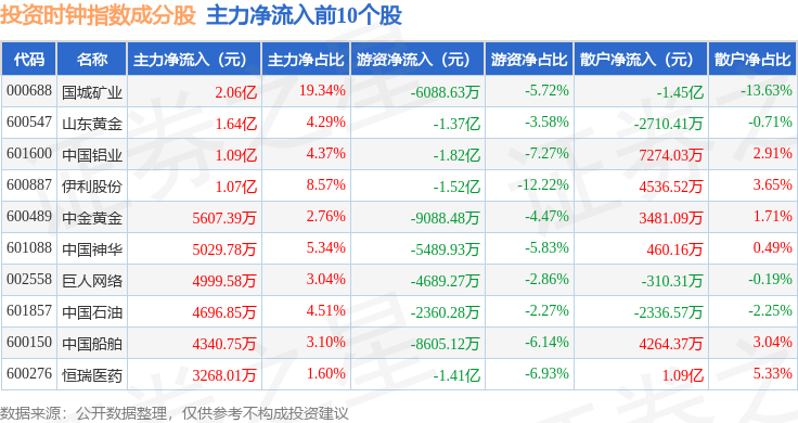 资金流向方面,投资时钟(399391)指数成份股当日主力资金净流出合计49.91亿元,游资资金净流入合计8.03亿元,散户资金净流入合计41.88亿元。成份股资金流向详情见下表: