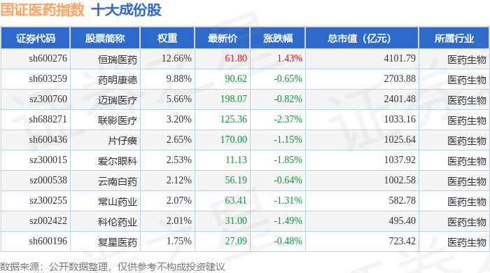 证券之星消息,12月23日,国证医药(399394)指数报收于8654.85点,跌0.44%,成交248.59亿元,换手率1.08%。当日该指数成份股中,上涨的有23家,迪哲医药以2.72%的涨幅领涨,下跌的有57家,美年健康以3.0%的跌幅领跌。