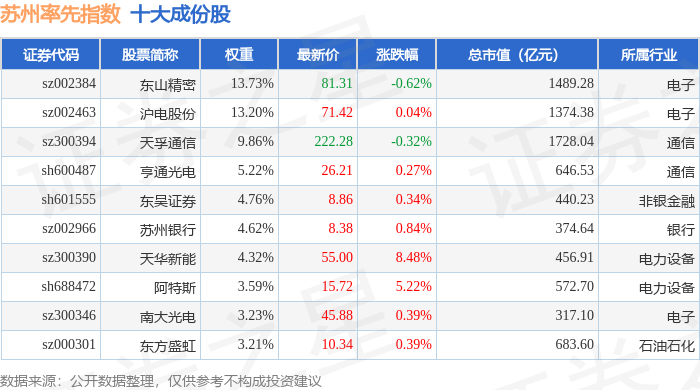 苏州率先(399410)指数十大成份股详情如下: