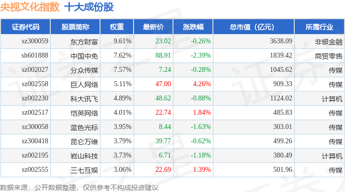 近10日内央视文化(399557)指数成份股做了调整,新纳入了1只股票,剔除了1只股票。