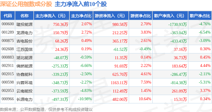 资金流向方面,深证公用(399622)指数成份股当日主力资金净流出合计2.08亿元,游资资金净流入合计1.13亿元,散户资金净流入合计9579.8万元。成份股资金流向详情见下表: