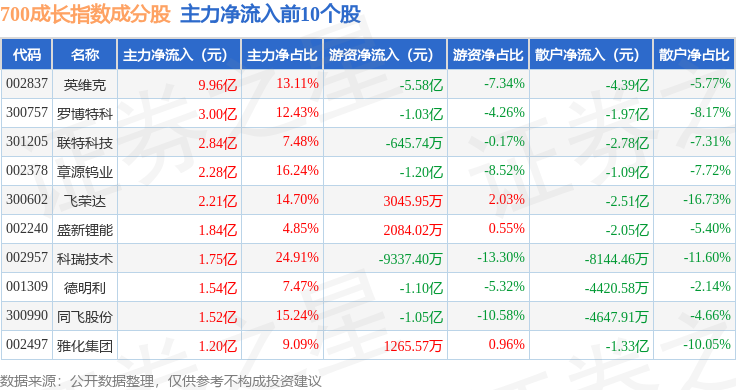 资金流向方面,700成长(399628)指数成份股当日主力资金净流出合计5.36亿元,游资资金净流出合计10.75亿元,散户资金净流入合计16.11亿元。成份股资金流向详情见下表: